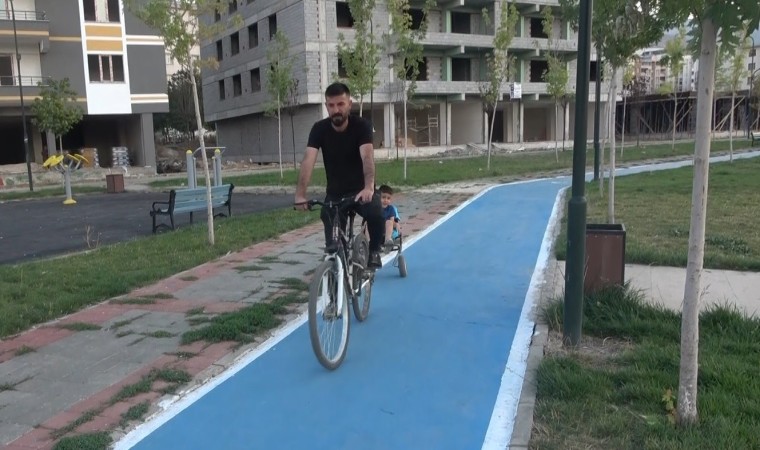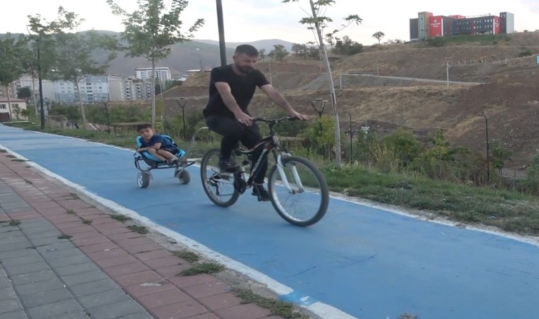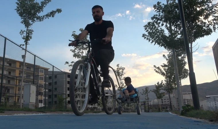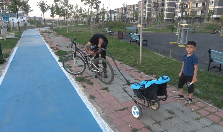Muş’ta bir baba geliştirdiği sistem sayesinde oğlu ile birlikte parkta rahatlıkla geziyor. Atık malzemelerden yaptığı iki tekerlekli bebek arabasını demir çubuk ile bisikletin arkasına bağlayarak parkları gezdiriyor. Baba bisiklet sürerken oğlu ise bebek arabasının koltuğunda keyif sürüyor.