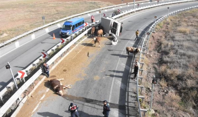 Kaza, saat 13.00 sıralarında Sivas-Kayseri kara yolu Kovalı köyü yakınlarında meydana geldi. Şarkışla'dan, Sivas yönüne giden Mehmet Yasak yönetimindeki 36 ABA 307 plakalı kamyonet, sürücünün kontrolünü yitirmesi sonucu devrildi. Kazada sürücü hafif yaralanırken, kamyonetin kasasındaki 8 büyükbaş hayvan ise yola savruldu. İhbar üzerine kaza yerine jandarma ve sağlık ekipleri sevk edildi. Sürücü, ambulansla Sivas Numune Hastanesi'ne kaldırılarak tedaviye alındı. Hayvanlardan birinin öldüğü belirlenirken, jandarma kazayla ilgili soruşturma başlattı. (DHA)