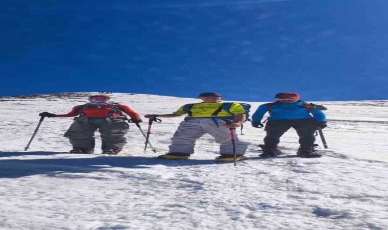 Ağrı Dağı’na tırmanmak için gelen bir grup dağcı, dağın eteklerinde kayak yaparak tırmanışlarına renk kattı.