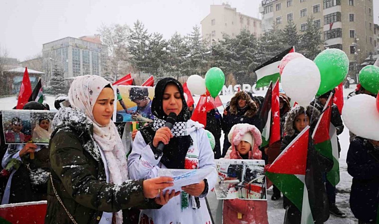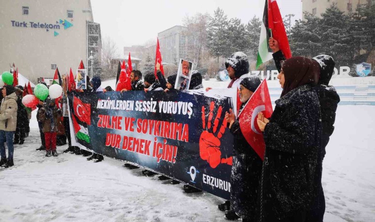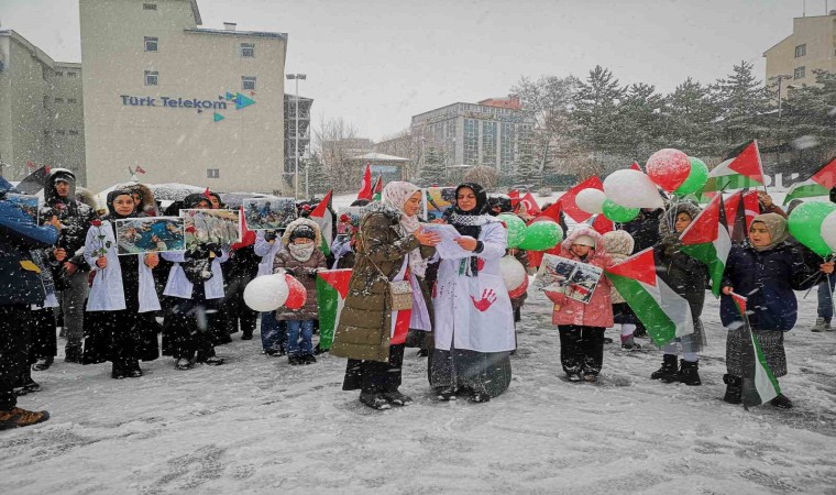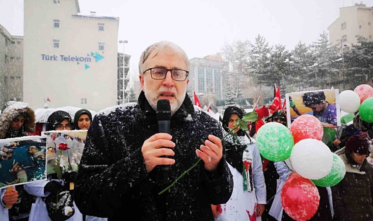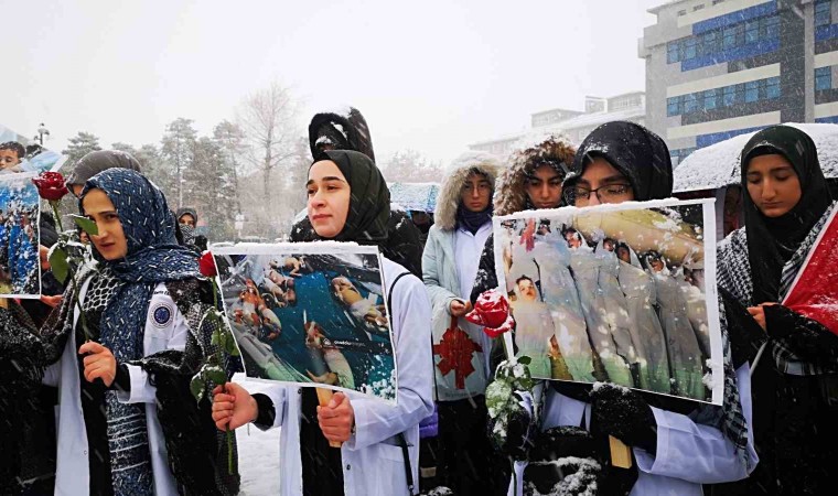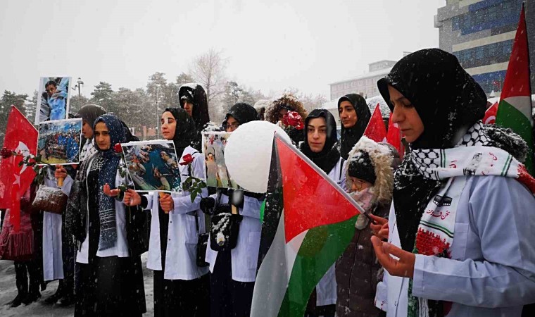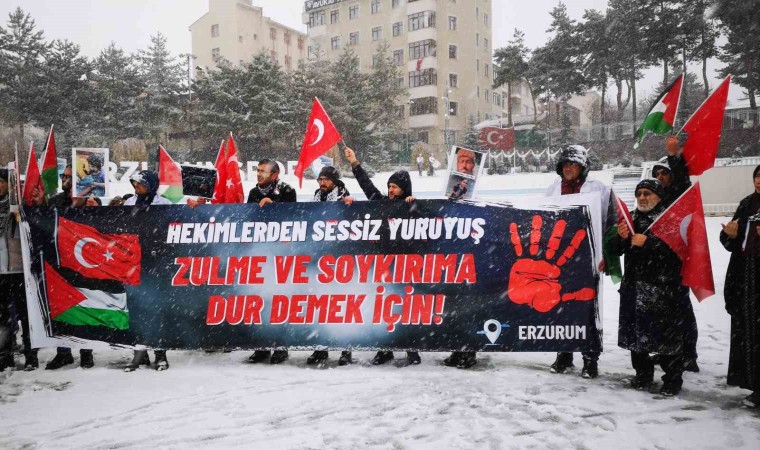 Erzurum’da yoğun kar yağışına rağmen Havuzbaşı Kent meydanında toplanan hekimler ve sağlık çalışanları, Filistin’de yaşanan drama dikkat çekerek İsrail’i kınadı.