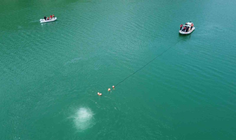 Gökdere Barajı’ndan helikopterin yaklaşık 35-40 metre derinlikten çıkarılması planlanırken dalgıçlar, 7 kaldırma balonunu helikoptere bağlayarak basınçla su yüzeyine yükseltme çalışmasını gün boyu sürdürdü.
