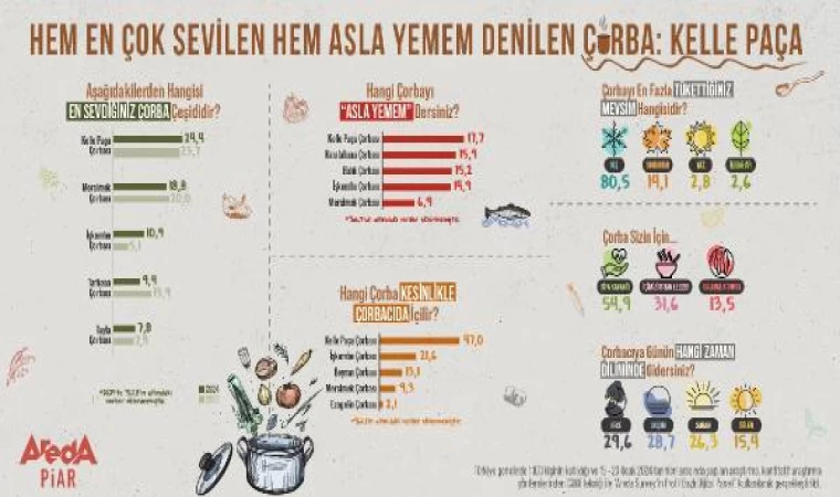 Areda Piar araştırma şirketi Türkiye genelinde bin 100 kişinin katılımıyla 4 Şubat Dünya Ev Yapımı Çorba Günü’ne özel çorba tüketimine yönelik bir araştırma gerçekleştirdi. Areda Piar’ın ilk olarak 2022 yılında gerçekleştirdiği çorba araştırmasında katılımcıların tercihi yüzde 23,7 ile kelle paça olmuştu. Aynı araştırma 2024 yılının ilk ayında tekrar gerçekleştirildi ve katılımcıların en sevdiği çorba yüzde 24,4 ile yine kelle paça oldu. Araştırmaya göre; katılımcılar kelle paça çorbasından sonra ikinci sırada yüzde 18,8 ile mercimek çorbasını, üçüncü sırada yüzde 10,9 ile işkembe çorbasını, dördüncü sırada yüzde 9,4 ile tarhana çorbasını ve beşinci sırada yüzde 7,8 ile yayla çorbasını seviyor.
