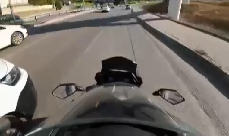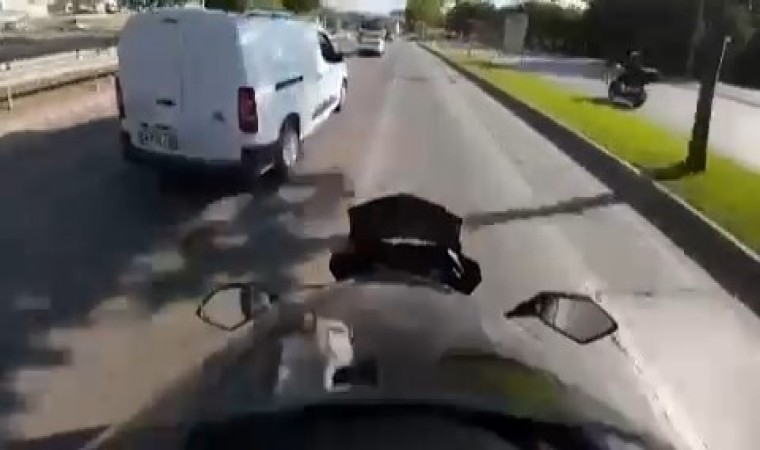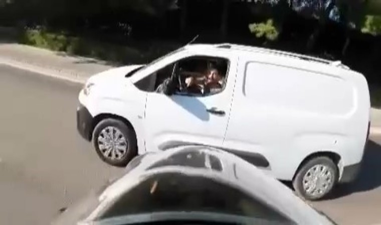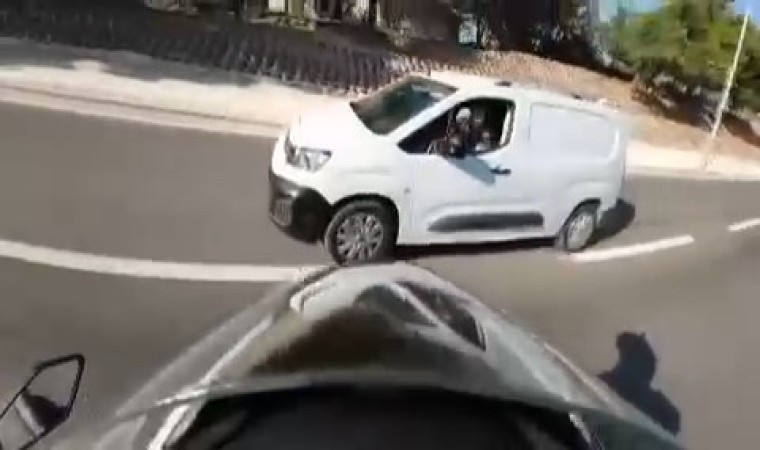 Merkez Nilüfer ilçesi Ata Bulvarı üzerinde seyir halindeki motosiklet sürücüsü şeridinde ilerlerken, İzmir yoluna doğru dönüş alacağı sırada orta şeritteki hafif ticari aracın sinyal vermeden önüne kırmasıyla ölümle burun buruna geldi. Kazayı kıl payı atlatan motosiklet sürücüsü, araç sürücüsüne yaklaşarak tepki gösterdi. Tepkilere küfürle karşılık veren araç sürücüsü "pes" dedirtirken, o anlar kask kamerasıyla kaydedildi.