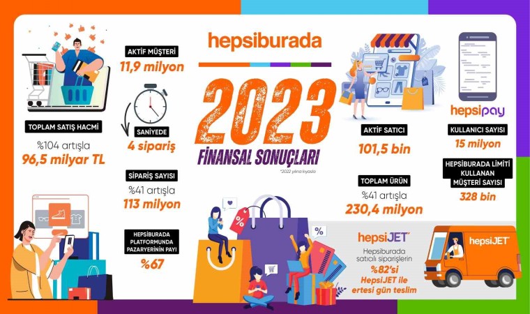 Global teknoloji borsası Nasdaq’ta işlem gören Hepsiburada, 2023 yılı son çeyreği ile yılın tamamına ilişkin finansal ve operasyonel sonuçlarını açıkladı. E-ticaret platformu, toplam satış hacmi, sipariş sayısı ve sıklığı, aktif satıcı ve müşteri sayısı ile ürün adedi gibi e-ticaret için stratejik öneme sahip tüm göstergelerde çok güçlü performans gösterdiği 2023 yılını yüzde 104 büyüme oranı ile kapadı.