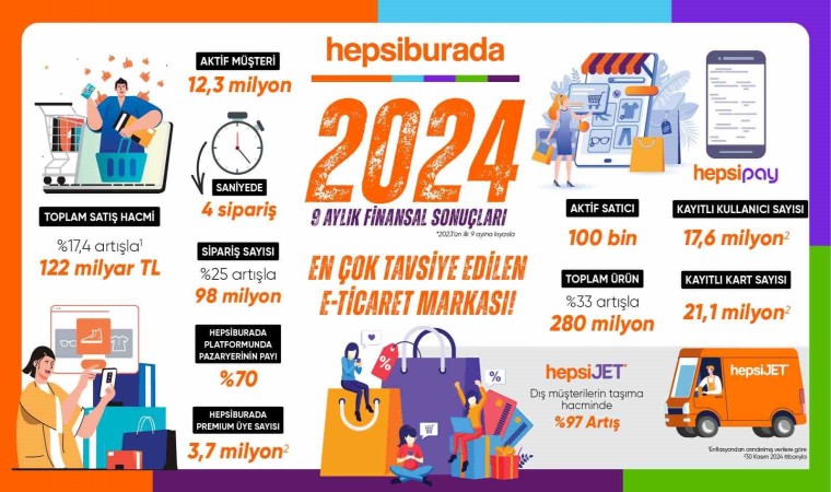 Konuyla ilgili değerlendirmelerde bulunan Hepsiburada CEO’su Nilhan Onal Gökçetekin, “Hepsiburada olarak, büyük bir gururla üstlendiğimiz ‘ticareti dijitalleştirme’ sorumluluğumuz sadece online bir alışveriş platformu oluşturmakla sınırlı değil. Müşterilerimizin kaliteli ve güvenilir ürünlere, en kolay ve en uygun şekilde ulaşmasını sağlamak, siparişten teslimata kadar onlara en iyi müşteri deneyimini sunmak, bu vizyonun vazgeçilmez bir unsuru. Bu anlayışın ve müşteri odaklı düşünce kültürünün, son dönemde ortaya koyduğumuz güçlü bilançoların en büyük destekçisi olduğuna inanıyoruz. Özellikle yoğun rekabetin bulunduğu sektörlerde, daha çok tasarruf üzerinden sağlanmaya çalışılan bilanço kalitesinin aslında müşteri memnuniyetinden ve operasyonel mükemmeliyetten geçtiğini çok iyi biliyoruz. 2024 yılı, şirket tarihinde, bunu rakamlarla da ortaya koyduğumuz önemli bir dönüm noktası oldu. Seneyi, toplam satış hacmimizde yaklaşık yüzde 75 oranında büyümeyle tamamlamayı bekliyoruz. Enflasyondan arındırıldığında yüzde 13 düzeyinde bir büyümeden bahsedebiliriz” dedi.