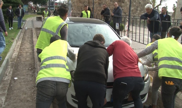 Rayların üzerine asılı kalarak sıkışan otomobili yaklaşık 3 gün sonra kurtarmak için çalışma başlatıldı. Belediye çalışanları ve çevredeki esnaflar, aracı sıkıştığı yerden kurtarmak için rayların bağlantı demirlerini kesti, ardından boşlukları kumla doldurdu. Lastiklerinin altına tahtalar koyarak aracı geriye doğru hareket ettirdi. Yaklaşık 1 saatlik çabanın ardından araç bulunduğu yerden çıkartıldı. 3 günlük mahsur kalan otomobiliyle kaldırımdan ilerleyen Muhittin T., normal araç yoluna girdikten sonra bölgeden ayrıldı.