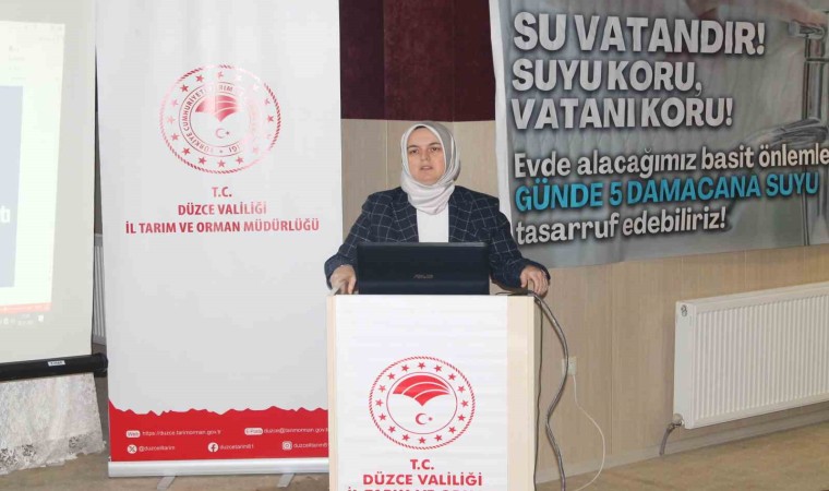 Bilgilendirme toplantısında konuşan Tarım ve Orman İl Müdürü Esra Uzun Düzce’nin sulak bir bölge olmasına karşın 2050 yılına kadar küresel ısınma sebebiyle iklimin değişmesi bekleniyor, kullanılan her fazla su damlasının çocukların geleceğinden çalınan su olduğunu, her bireyin kendisine ve çocuklarına su tasarrufu bilincini aşılaması gerektiğini, bakanlıkça hazırlanan yönergeyle su tasarrufu konusunda faaliyetler yürüterek hedefimizin minimum su kullanımını hayatımıza yerleştirmek olduğunu söyledi.