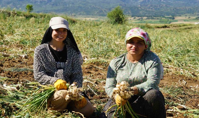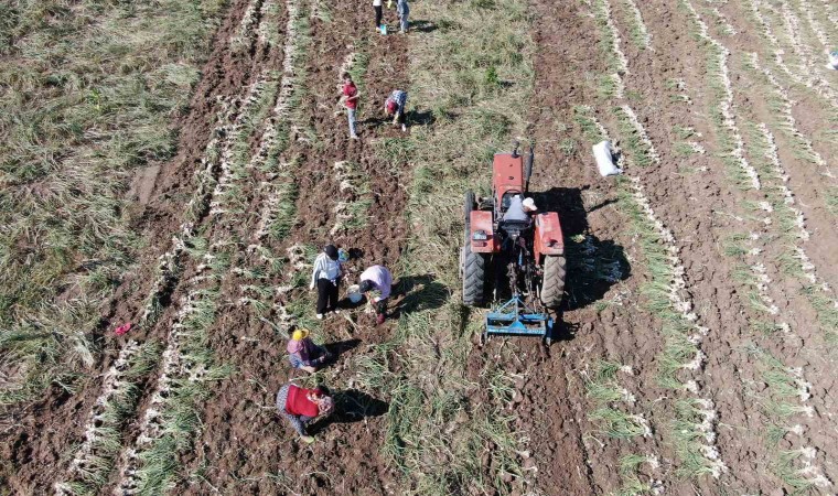 Traktör ile topraktan çıkartılan sarımsakları topladıklarını söyleyen Kahraman, “Bu topladığımız sarımsakların uçlarını temizleyip bir bağ haline getiriyoruz ve bağladıktan sonra tarlaya tekrar bırakıyoruz. Zor değil ama sıcak olduğu için biraz zorluyor” şeklinde konuştu.