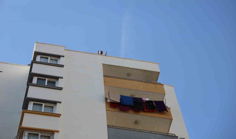 Yağmur yağıyor sanılan görüntüde aslında bir apartmanın damındaki güneş enerjisinin borusunun patladığı ve bu suyun 10 katlı apartmanın damında yere fışkırdığı ortaya çıktı.