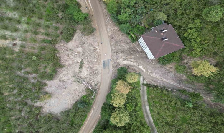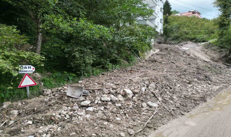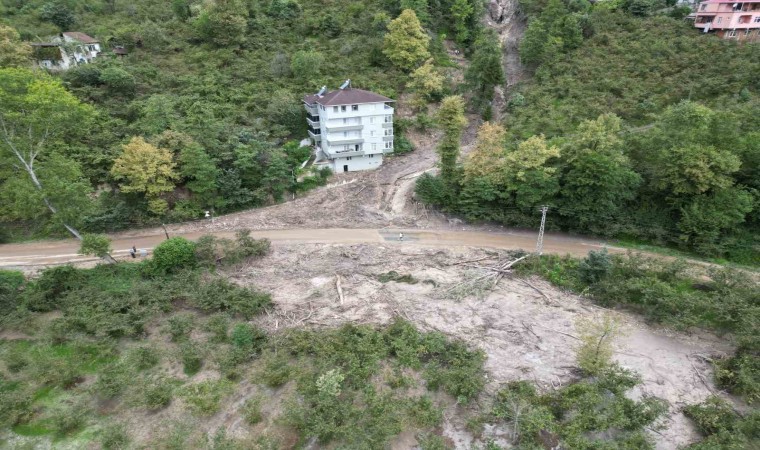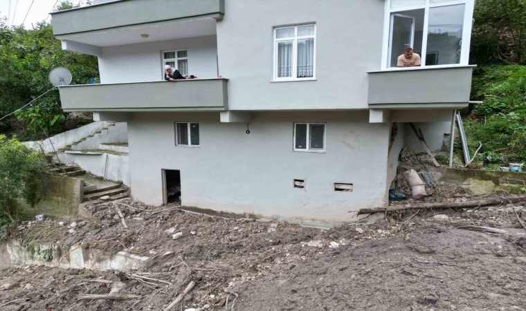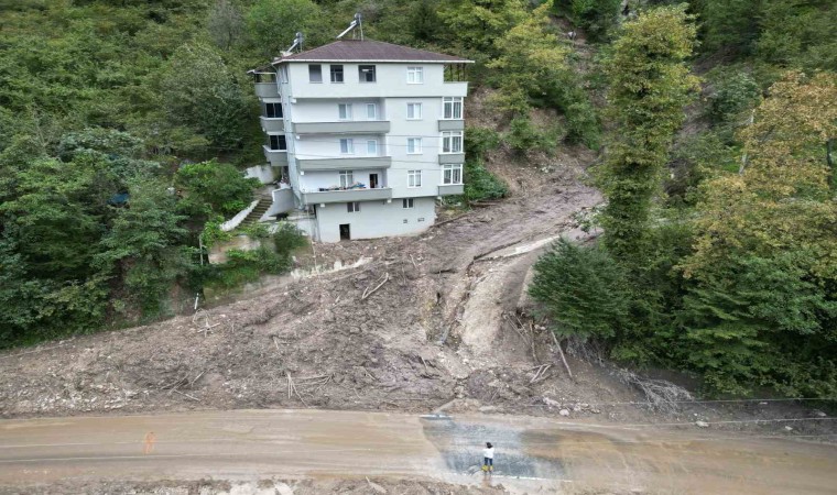 Trabzon’da önceki gün etkisini gören şiddetli yağışların ardından meydana gelen sel ve heyelanların izlerini sarılmaya çalışılıyor. 4 ilçede etkisini gösteren şiddetli yağışlar nedeniyle bazı mahalle yolları ulaşıma kapanırken, belediye ve karayolları ekiplerince yapılan çalışmalar sürüyor. Arsin ilçesinin Yolüstü mahallesinde bulunan Can Küme Evleri’ndeki 5 katlı bina ise heyelanı teğet geçti. Aşırı yağışların ardından büyük bir gürültü ile meydana gelen heyelan 5 katlı binanın zemin katında maddi hasara neden olurken, 5 hanenin bulunduğu binanın yolu da toprak ve taş parçaları ile kapandı. Binada yaşayan bazı vatandaşlar komşularının evine giderken, bina sakinlerinden Aziz Can, “Akşam saatlerinde evde oturuyordum. Aniden bir heyelan. Şiddetli bir şekilde geldi. Gördüğünüz gibi yolumuzu kapattı. Evden çıkarak komşunun evine sığındım. Apartmanda patlamalar var. Ciddi bir hasar var. Sanki deprem oldu. Büyük bir ses oldu. Koku yaşadık. Evime giremedim. Çok hafriyat var. Bir an önce açılması lazım. Binada 5 hane var” dedi.
