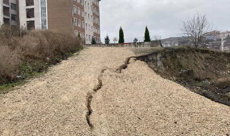 Murat ÖZELCİ/KARABÜK, (DHA)- KARABÜK'te, 2 okulun yakınında heyelan meydana geldi. Heyelan nedeniyle okullara 30 metre mesafedeki yolun bir kısmı çöktü, derin yarık oluştu.