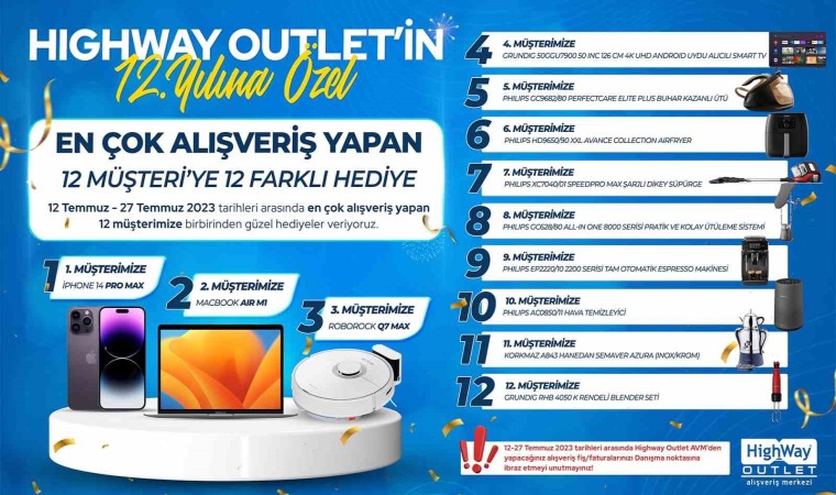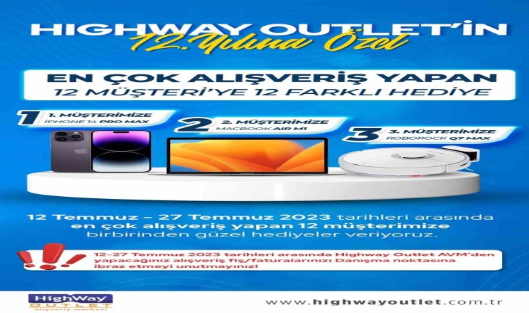 Geçtiğimiz yıl 28 Temmuz’da 11. yıl dönümünü Hande Yener konserine ev sahipliği yaparak kutlayan HighWay Outlet, bu yıl 12. yıldönümünü en çok alışveriş yapan ilk 12 müşteriye 12 farklı büyük hediye vererek kutlayacak. 12. yıldönümü kutlamaları dahilinde 12-27 Temmuz 2023 tarihleri arasında HighWay Outlet AVM’den alışveriş yapan müşteriler fiş veya faturalarını danışma noktasına gelerek ibraz edecekler ve kampanyaya katılım hakkı sağlayabilecekler. Kampanyanın sonunda, 28 Temmuz Cuma günü ibraz edilen fiş veya faturalar sonucunda en çok alışveriş yapan 12 kişi belirlenerek birbirinden güzel hediyeler sahiplerini bulmuş olacak. En çok alışveriş yapan 1. müşteri; ‘IPHONE 14 PRO MAX’, 2. Müşteri; ‘MACBOOK AIR M1’, 3. Müşteri; ‘ROBOROCK Q7 MAX’ ve ödül hakkı kazanan diğer müşteriler birbirinden güzel hediyelerin sahibi olacak. Ödül kazanan müşteriler, ödüllerini 28 Temmuz itibarıyla alışveriş merkezi danışma noktasına gelerek kimlik ibrazı ile teslim alabilecek.