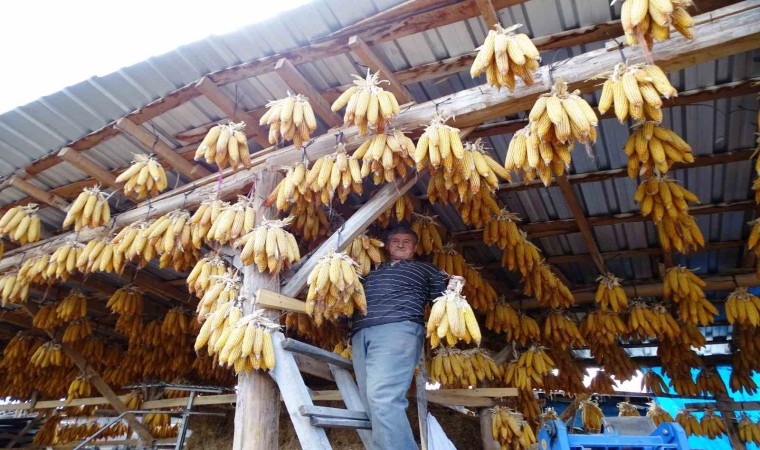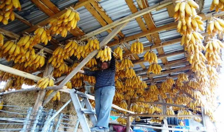 82. Yıl Mahallesinde çiftliği bulunan Ali Özkan, yıllardan beri tarlasından hasat ettiği mısırların kabuklarını sıyırıp koparmadan 10-15 mısırı birbirine bağlayıp üstü kapalı bir yere asarak aylarca muhafaza ediyor.