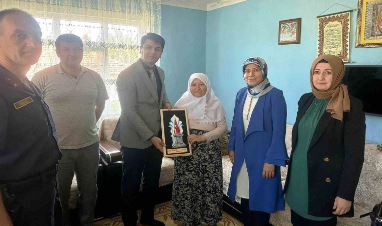 Devletin tüm imkanlarıyla şehit ailelerinin yanında olduğunu ifade eden Kaymakam Muhammet Samet Bahar, şehit annesi Sabriye Öğüt’e hediye takdim etti.