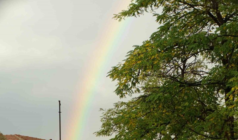 Kütahya’nın Hisarcık ilçesinde yağan sağanak yağmurun ardından ortaya çıkan gökkuşağı görenleri hayran bıraktı.