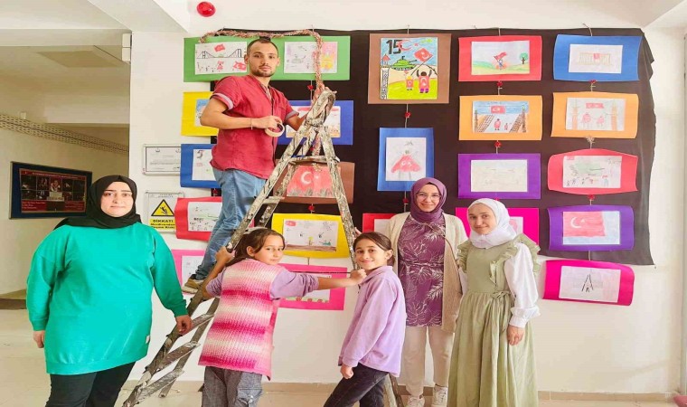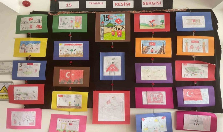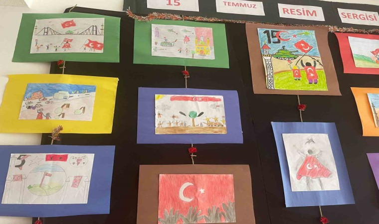 Atatürk İlkokulu öğrencilerinin 15 Temmuz Darbe Girişimi anısına çizdikleri resimler okul koridorunda 15 Temmuz panosunda sergilendi.