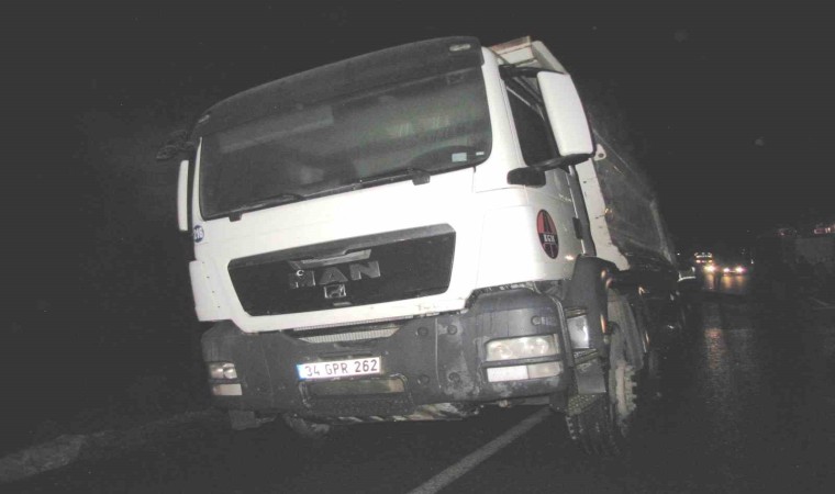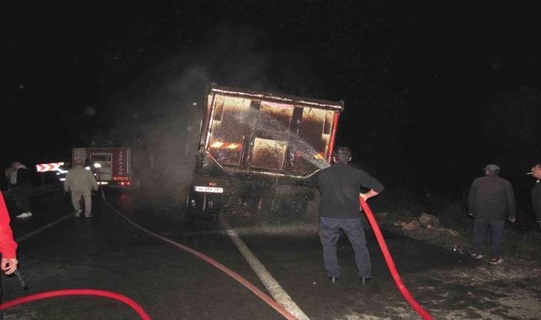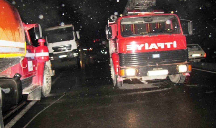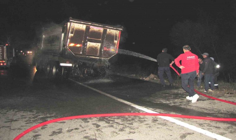 Emet-Hisarcık karayolunda seyir halindeki sıcak asfalt malzemesi yüklü kamyonun patlayıp alev alan lastiği itfaiye ekiplerince söndürüldü.