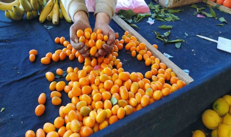 Pazarda Mersin’in Anamur ilçesinden getirdiği Kamkat meyvesini 70 TL’den satışa sunan Ahmet Koç, kabuğuyla birlikte tüketilen tek turunçgil meyvesi olan kamkatın kokusu ve tadıyla tüketiciyi cezbettiği söyledi.