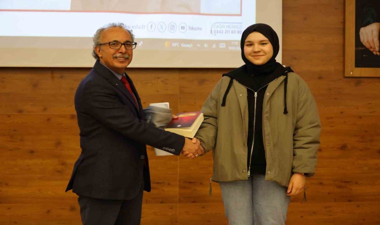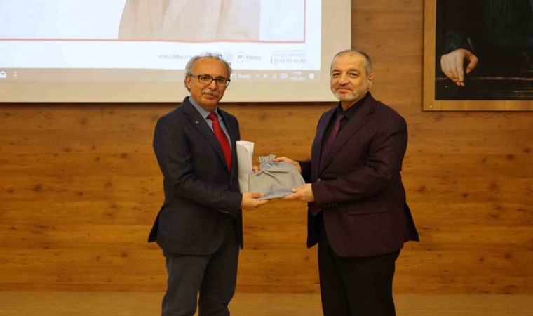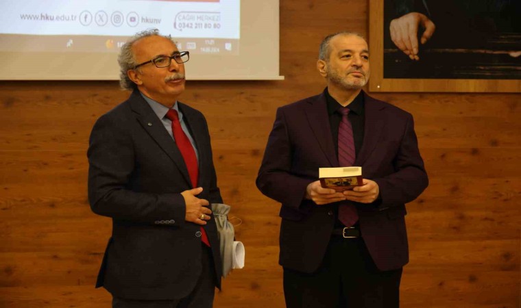 İstiklal Şairimiz Mehmet Akif Ersoy’un hayatından kesitleri, İstiklal Marşı yazılırken gerçekleşen olayları ve Çanakkale Deniz Zaferi ilgili önemli tespitlerini paylaştığı sunumu sonrasında, Doç. Dr. Ahmet Keser’e hediyesini HKÜ Rektörü Prof. Dr. Türkay Dereli takdim etti. Program sonunda, Mehmet Akif Ersoy’un Safahat isimli kitabı öğrencilere hediye edildi.
