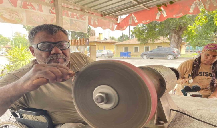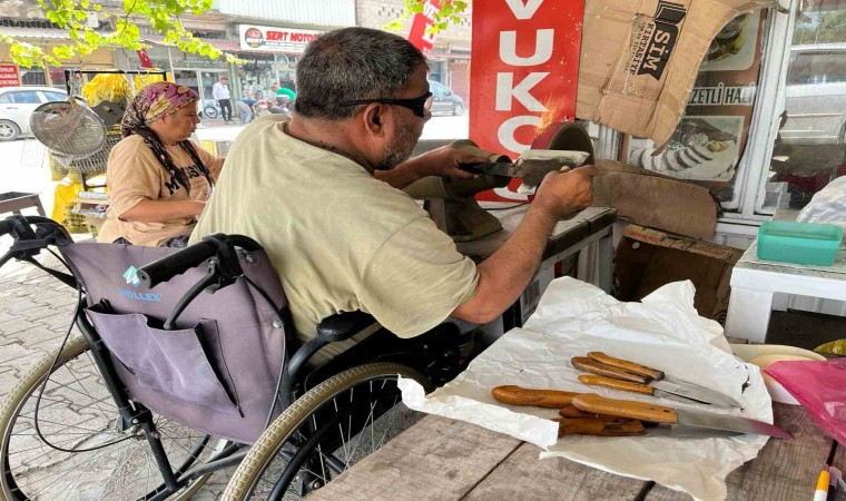 Hobi olarak başladığı işin bir anda mesleği olduğunu söyleyen Hüseyin Köksal, "Bir buçuk yaşında çocuk felci geçirdim, belden aşağım tutmuyor ama normal bir insan gibi sadece yürüyemiyorum. Bütün işlerimi kendim yapıyorum okul hayatım, eğitimim hepsini aldım, el işlerimi geliştirdim. 6 Şubat depremlerinde evimiz yıkıldı bahçemize kurduğumuz konteynır da yaşıyoruz. Çok şükür, canımız sağ diyoruz yani şükrediyoruz. TOKİ’ye yazıldık işte, ev bekliyoruz. Bıçak işine de amatör olarak başladım evde yapıyordum kendim kendime, bazı el işlerim var, onlarla uğraşıyordum. Baktım komşularına falan talep var, ben de bu talebi boş çevirmedim yani bu işi mesleğe dönüştürdüm. Mesleğe dönüştürdüğüm de baktım talep daha da arttı, çarşıda bir yer açtım işlerim gelişti. Toprakkale, Osmaniye, Ceyhan’a kadar mesela ilçeler, köyler, kasabalar bana geliyor. Günlük yaklaşık bin 500 bıçak yapıyorum, artı bıçak satıyorum. Bütün malzemelerimiz var onları satıyor bu şekilde geçimimi sağlıyorum. Kazandığım parayı da oğlum var, üniversitede son sınıf Allah izin verirse bitirecek bu sene gelirimi onun eğitim hayatına harcıyorum" diye konuştu.