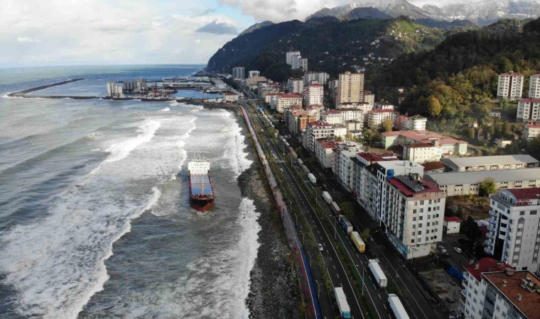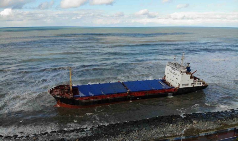 Artvin’in Hopa ilçesinde dün etkili olan fırtınada karaya oturan kuru yük gemisi bulunduğu yerden kurtarılmayı bekliyor.