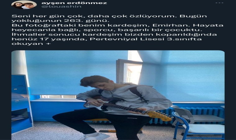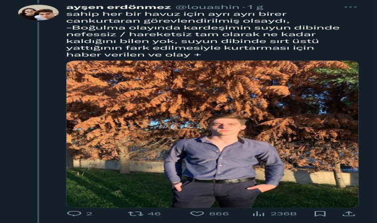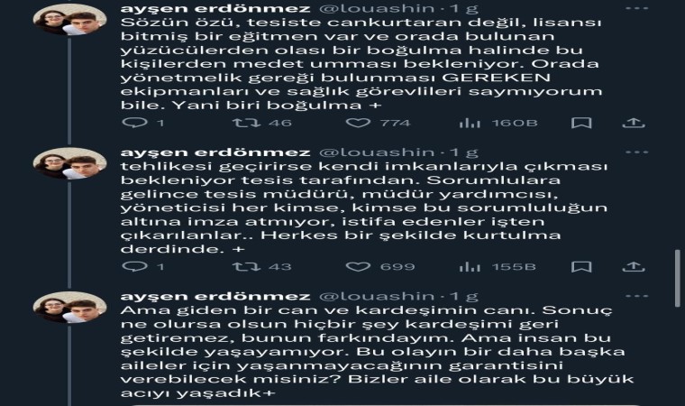 "Ambulans gelene kadar geçen yaklaşık 20 dakika süre içerisinde yapılan ilk müdahale esnasında, yüzmeye gelen diğer vatandaşlardan ‘aranızda doktor var mı’ diye sorularak medet umulmadan, ilk yardım kursunu almış, gerekli teçhizata sahip uzman kişiler tarafından müdahalesi yapılmış olsaydı. Olay sonrası çağrılan ambulans 20 dakika sonra değil de daha erken süre içerisinde gelmiş olsaydı, zira Emirhan’ın kaldırıldığı hastane tesise sadece 600 metre, yürüyerek götürülse bile daha hızlı müdahale edilirdi, şu an aramızda olabilirdi. Sözün özü, tesiste cankurtaran değil, lisansı bitmiş bir eğitmen var ve orada bulunan yüzücülerden olası bir boğulma halinde bu kişilerden medet umması bekleniyor. Orada yönetmelik gereği bulunması gereken ekipmanları ve sağlık görevlileri saymıyorum bile. Yani biri boğulma tehlikesi geçirirse kendi imkanlarıyla çıkması bekleniyor tesis tarafından. Sorumlulara gelince tesis müdürü, müdür yardımcısı, yöneticisi her kimse, kimse bu sorumluluğun altına imza atmıyor, istifa edenler işten çıkarılanlar. Herkes bir şekilde kurtulma derdinde. Ama giden bir can ve kardeşimin canı. Sonuç ne olursa olsun hiçbir şey kardeşimi geri getiremez, bunun farkındayım. Ama insan bu şekilde yaşayamıyor. Bu olayın bir daha başka aileler için yaşanmayacağının garantisini verebilecek misiniz? Bizler aile olarak bu büyük acıyı yaşadık yaşamaya da devam edeceğiz ve seni hiçbir zaman unutmayacağız canım kardeşim.”