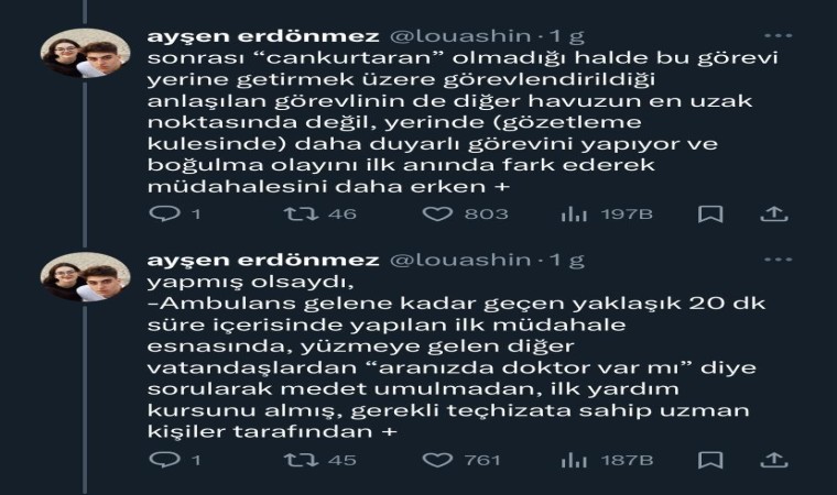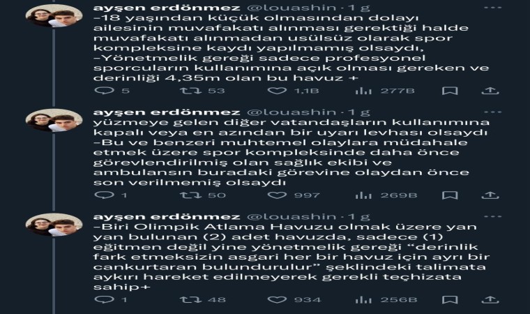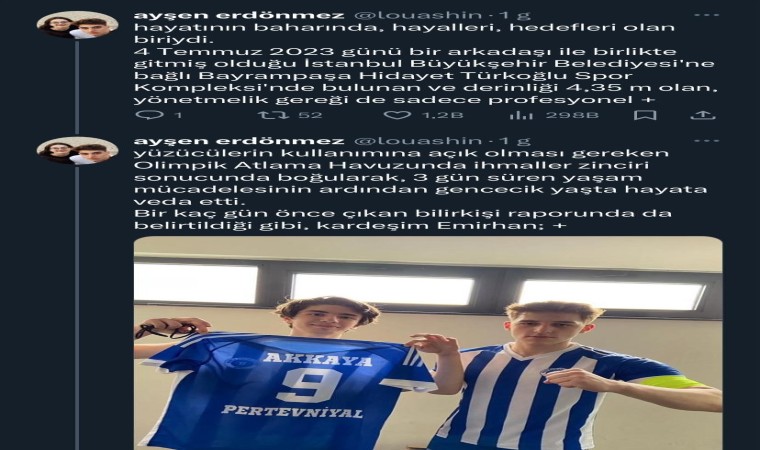 İstanbul Büyükşehir Belediyesine bağlı Bayrampaşa Hidayet Türkoğlu Spor Kompleksi’nde boğulan Emirhan Erdönmez’in ablası Ayşen Erdönmez, yaptığı paylaşımda, "Tesiste cankurtaran değil, lisansı bitmiş bir eğitmen var. Bir boğulma halinde bu kişilerden medet umması bekleniyor. Orada yönetmelik gereği bulunması gereken ekipmanları ve sağlık görevlileri saymıyorum bile. Biri boğulma tehlikesi geçirirse kendi imkanlarıyla çıkması bekleniyor tesis tarafından. Sorumlulara gelince tesis müdürü, müdür yardımcısı, yöneticisi her kimse, kimse bu sorumluluğun altına imza atmıyor” dedi.