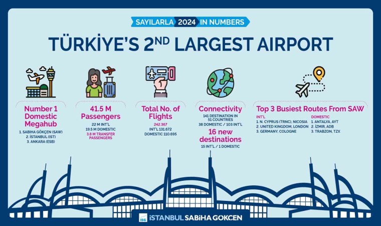 2024 yılında Sabiha Gökçen’de iç hatlarda 110 bin 695, dış hatlarda 131 bin 672 sefer yapılırken, toplam uçuş sayısı 242 bin 367 olarak hesaplandı. İSG,2024’te 15 dış hat ve 1 iç hat olmak üzere toplam 16 yeni destinasyonu bağlantı ağına ekleyerek uzakları yakınlaştırdı. Sabiha Gökçen Uluslararası Havalimanı, 2024’te dünyada en fazla ziyaret edilen şehirler arasında yer alan İstanbul’u, 51 ülkede 38 iç hat ve 103 dış hat olmak üzere toplam 141 destinasyon ile buluşturdu.