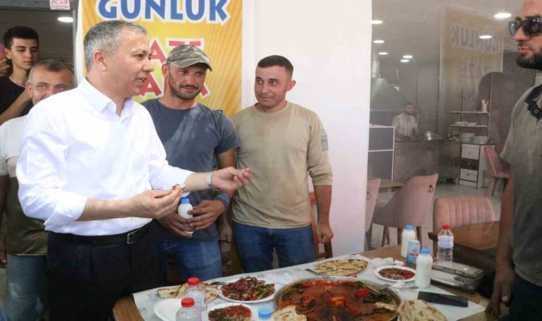 İçişleri Bakanı Ali Yerlikaya, Hatay’da esnaf ziyareti esnasında bir lokantada yemek yiyen vatandaşlarla sohbet ederek tescilli lezzet tepsi kebabının tadına baktı.
