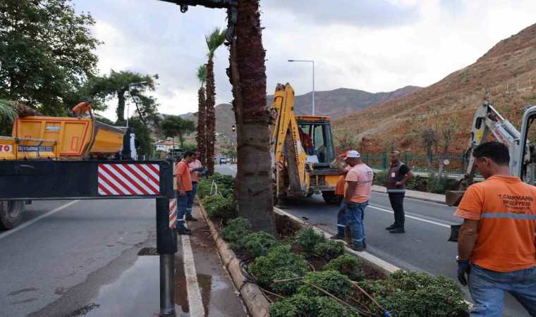 Geçtiğimiz yıl yaz başında İçmeler Mahallesi Atatürk Caddesi, Marmaris Belediyesi Fen İşleri Müdürlüğünce yürütülen çalışmalar sonucunda yeni yüzüne kavuşmuştu. Ardından peyzaj çalışmaları için devreye Park ve Bahçeler Müdürlüğü girmişti. Çalışmalar kapsamında orta refüje 14 palmiye ağacı dikilirken, başka bitkilerle de yeşillendirme çalışmaları sürdürülmüştü. Peyzaj çalışmaları kapsamında sonbahar mevsimiyle birlikte 2. tur ağaç dikimine geçildi. Dün başlatılan çalışmayla Atatürk Caddesi’nin, Cumhuriyet Caddesi ayrımına kadar olan bölümüne 23 palmiye ağacı dikilecek. Bölgeyi kontrollü olarak araç trafiğine kapatan ekipler vinç yardımıyla titiz bir çalışma yürüterek ağaçları toprakla buluşturdu.
