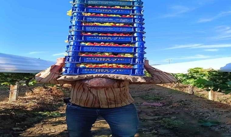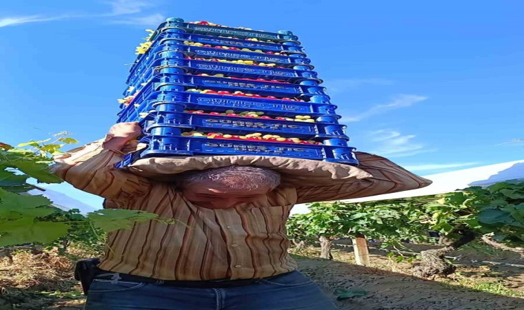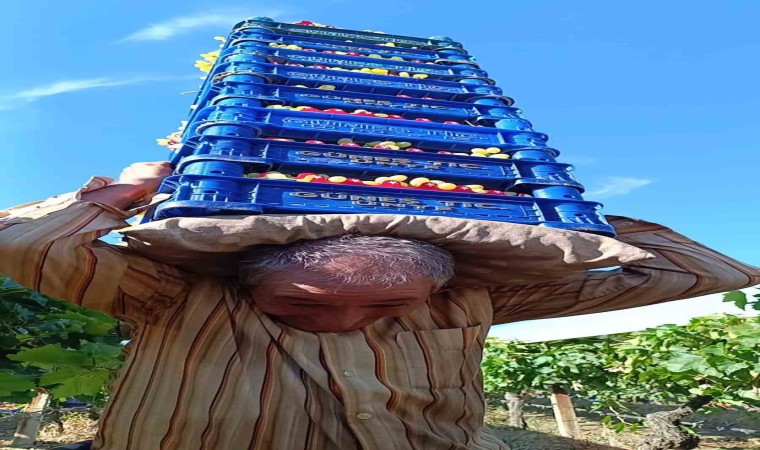 Manisa’nın Sarıgöl ilçesinde üzüm taşıma konusunda arkadaşlarıyla girdiği iddialarla her geçen gün sırtında taşıdığı üzüm kasası sayısını arttıran 62 yaşındaki üzüm işçisi, toplamda 115 kilogram gelen 8 kasa üzümü aynı anda sırtında taşıyor.