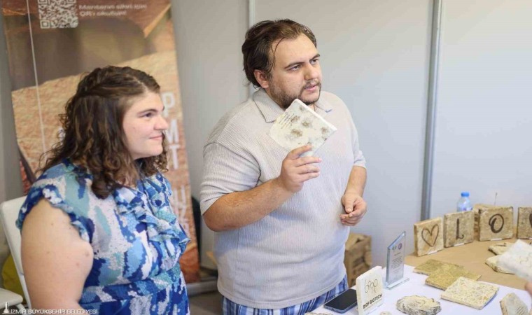 Biop Biotech Biyoteknoloji firması kurucularından Berker Çetintaş, “Dokuz Eylül Üniversitesi Teknopark’ta bir kuluçka firması olarak yer alıyoruz. Üç projemizle beraber iki yıl önce kurulduk. Doğal bir malzeme geliştirdik. Mantarlar ve organik atıkları kullanarak geliştirdiğimiz malzememiz tamamen doğal bir ürün. Basınca dayanıklı, ısı, ses yalıtımlı ve yanmaz özelliklerine sahip. Malzememiz iç mekan tasarımında, binalarda yapı işlerinde kullanılmak üzere üretiliyor. Doğaya dayalı, sürdürülebilir biyomalzemeler ile daha yeşil bir gelecek için yenilikçi çözümler üretiyoruz. Atıkları yeniden kullanmanın yenilikçi yollarını araştırıyoruz” açıklamalarında bulundu.
