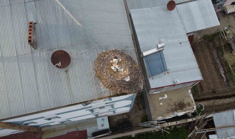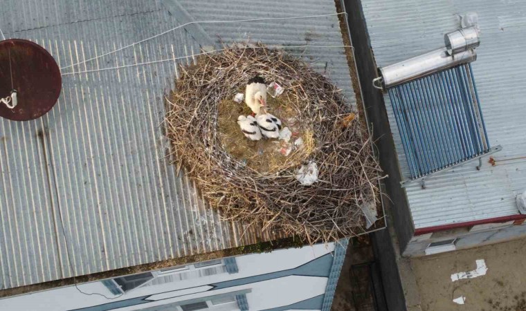Iğdır’da yumurtadan çıkarak büyümeye başlayan yavru leylekler havadan görüntülendi.