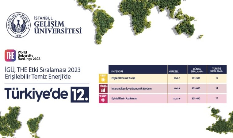 İngiltere merkezli, dünyanın öncü yükseköğretim derecelendirme kuruluşu Times Higher Education (THE) 2023 sıralamasında yer alan bin 591 üniversitenin başvuru yaptığı listede İstanbul Gelişim Üniversitesi’nin (İGÜ) başarısı Birleşmiş Milletler Sürdürülebilir Kalkınma Hedefleri doğrultusunda altı farklı kategoride derecelendirildi. Etki Sıralaması (Impact Ranking) 2023 listesinde bu yıl ilk defa “Erişilebilir Temiz Enerji” kategorisinde yer alan İGÜ, Türkiye üniversiteleri arasında 12’nci sırada derecelendirildi.