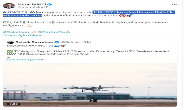 ROKETSAN Genel Müdür Murat Ekici ise paylaşımında, “AKINCI TİHA’dan yapılan test atışında İHA-122 Havadan Karaya Balistik Süpersonik Füzemiz hedefini tam isabetle vurdu. Güç birliği ile tam bağımsız milli teknolojilerimiz için çalışmaya devam ediyoruz” dedi.