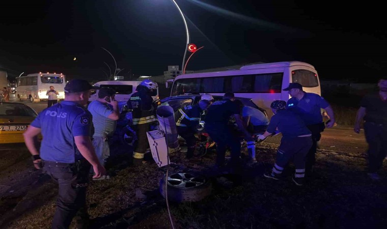 Kaza, Tekirdağ’ın Çerkezköy ilçesinde 23.30 sularında meydana geldi. Edinilen bilgilere göre, Çerkezköy istikametinden Kızılpınar istikametine seyir halinde bulunan 59 T 2745 plakalı ticari taksi ile kavşaktan ana yola giren 34 VV 3450 plakalı araç kafa kafaya çarpıştı. Kazada ticari taksinin motoru yaklaşık 20 metre ileri fırlarken, refüjlerde bulunan elektrik direği de otomobilin üzerine düştü. Korkunç kazayı görenler durumu itfaiye ekipleri, polis ekipleri ve 112 sağlık ekiplerine bildirdi. İhbar üzerine olay yerine gelen itfaiye ekipleri aracın kapılarını keserek içeride mahsur kalan 2 yaralıyı çıkardı. Taksi sürücüsü M.E. de araçtan çıkarıldı. Yaralılar yapılan ilk müdahalenin ardından ilçedeki hastanelere sevk edildi. Yaralıların tedavilerinin sürdüğü öğrenildi. Polis ekipleri yolu trafiğe kısmi şekilde kapatırken olası zincirleme kazanın önüne geçti. Olay yerine gelen TREDAŞ ekipleri de önlem alarak elektrikleri keserken, polis ekipleri olayla ilgili geniş çaplı inceleme başlattı.