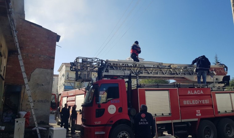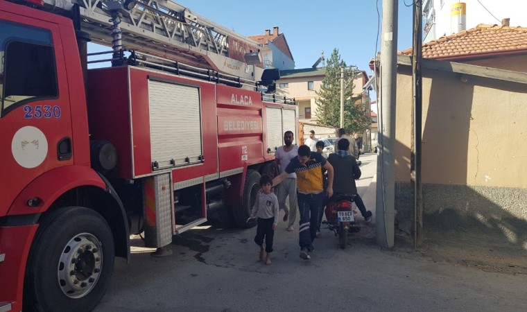 Çorum’un Alaca ilçesinde iki katlı bir evde yangın. Üst katta mahsur kalan çocuğu eve giren itfaiye ekipleri kurtardı.