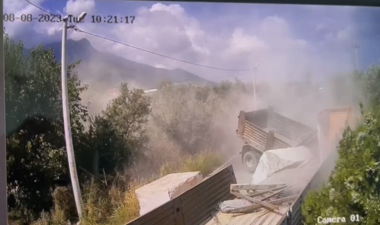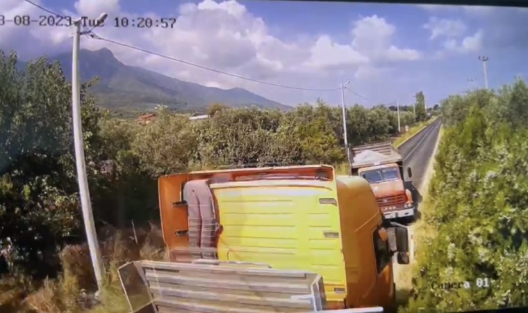Bursa’nın Orhangazi ilçesinde iki kişinin ağır yaralandığı kamyon ile mermer yüklü tırın çarpışması anbean kameraya yansıdı.