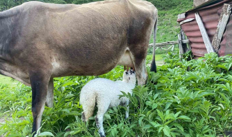 Artvin’in Kemalpaşa ilçesinde ikiz doğan kuzulardan birine anne koyun bakamayınca ve sütü yeterli gelmeyince çiftliğin ineği kuzuya annelik yapmaya başladı.
