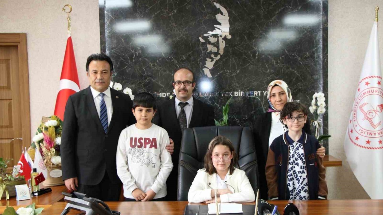 Kayseri İl Milli Eğitim Müdürü Bahameddin Karaköse, 23 Nisan Ulusal Egemenlik ve Çocuk Bayramı dolayısıyla koltuğunu Şehit Mehmet Erdoğan İlkokulu 4. sınıf öğrencisi Esila Kandemir’e devretti.