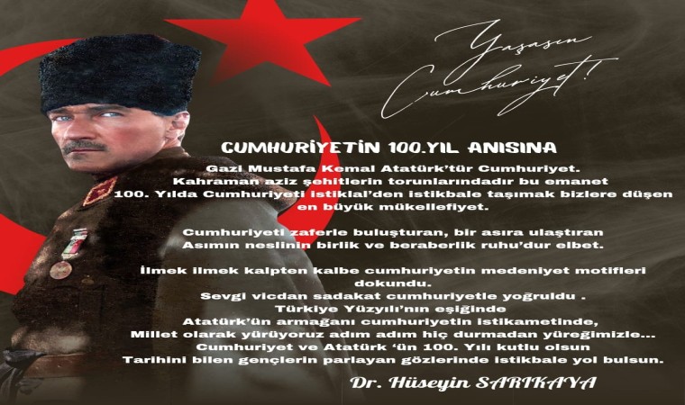 İl Sağlık Müdürü Dr. Hüseyin Sarıkaya, sosyal medya hesabından Cumhuriyet’in 100. yılı anısına yazdığı şiiri paylaştı. Sarıkaya’nın yazdığı şiir şöyle: