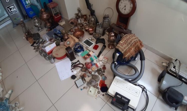 Hırsızın, çaldığı ürünleri sakladığı 2 evde de arama yapıldı. Evlerden aralarında duvar süsü, bakır tencereler, eski tabancalar, kullanılmayan telefonlar, olta, gitar, 100 metre uzunluğunda kablo ve hediyelik eşyalar gibi birçok parçanın bulunduğu bin ürün çıktı.