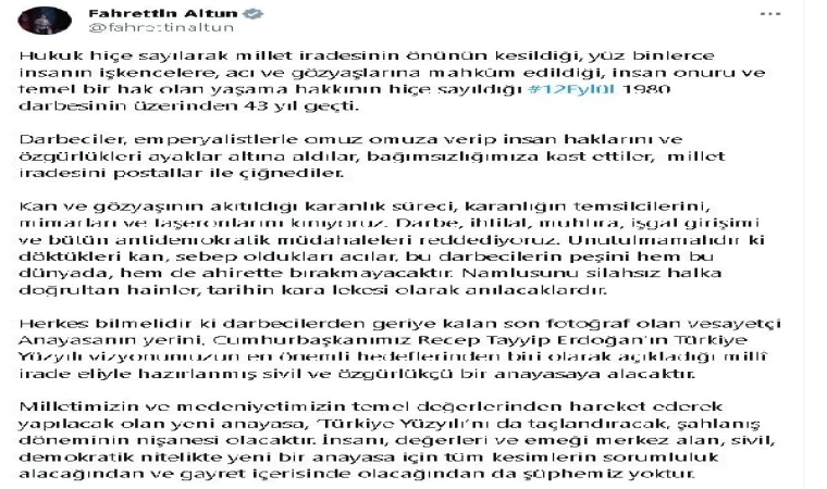 İLETİŞİM Başkanı Fahrettin Altun, 12 Eylül 1980 darbesinin 43. yıl dönümünde yaptığı açıklamada, darbecilerin Türkiye'yi geriye bırakan vesayetçi anayasanın yerini, Cumhurbaşkanı Recep Tayyip Erdoğan'ın Türkiye Yüzyılı vizyonunun bir parçası olarak açıkladığı milli iradeyle hazırlanan sivil ve özgürlükçü bir anayasa ile değiştirileceğini belirtti.