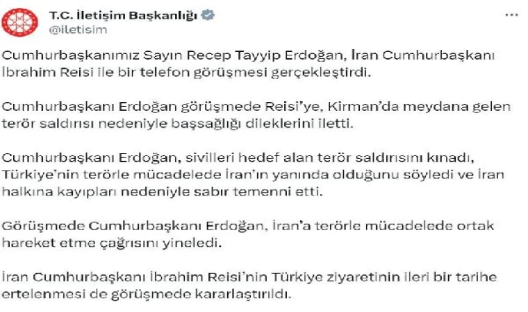 İletişim Başkanlığı’ndan yapılan açıklamada, ''Cumhurbaşkanımız Sayın Recep Tayyip Erdoğan, İran Cumhurbaşkanı İbrahim Reisi ile bir telefon görüşmesi gerçekleştirdi. Cumhurbaşkanı Erdoğan görüşmede Reisi’ye, Kirman’da meydana gelen terör saldırısı nedeniyle başsağlığı dileklerini iletti. Cumhurbaşkanı Erdoğan, sivilleri hedef alan terör saldırısını kınadı, Türkiye’nin terörle mücadelede İran’ın yanında olduğunu söyledi ve İran halkına kayıpları nedeniyle sabır temenni etti’’ ifadesi yer aldı.