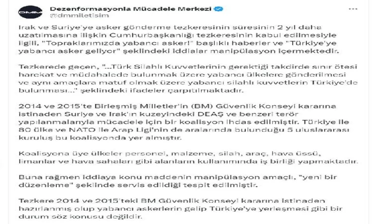 Dezenformasyonla Mücadele Merkezi'nin sosyal medya hesabından yapılan açıklamada, Irak ve Suriye'ye asker gönderme tezkeresinin süresinin 2 yıl daha uzatılmasına ilişkin Cumhurbaşkanlığı tezkeresinin kabul edilmesiyle ilgili, 'Topraklarımızda yabancı asker' başlıklı haberler ve 'Türkiye'ye yabancı asker geliyor' şeklindeki iddiaların manipülasyon içerdiği belirtildi. Açıklamada şöyle denildi: