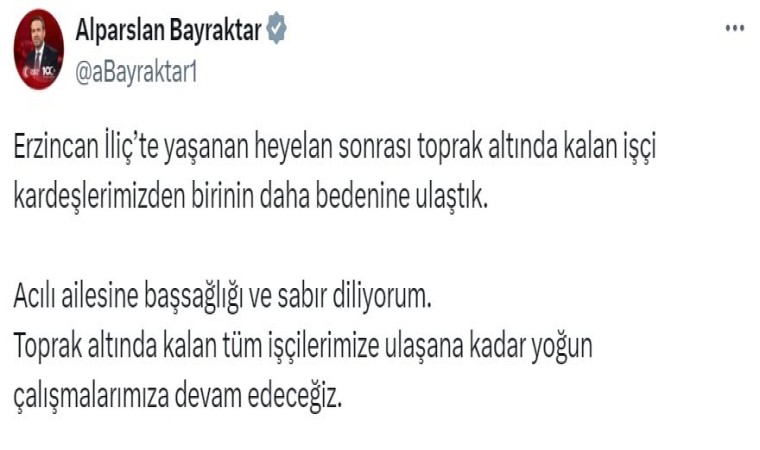 “Erzincan İliç’te yaşanan heyelan sonrası toprak altında kalan işçi kardeşlerimizden birinin daha bedenine ulaştık. Acılı ailesine başsağlığı ve sabır diliyorum. Toprak altında kalan tüm işçilerimize ulaşana kadar yoğun çalışmalarımıza devam edeceğiz.”