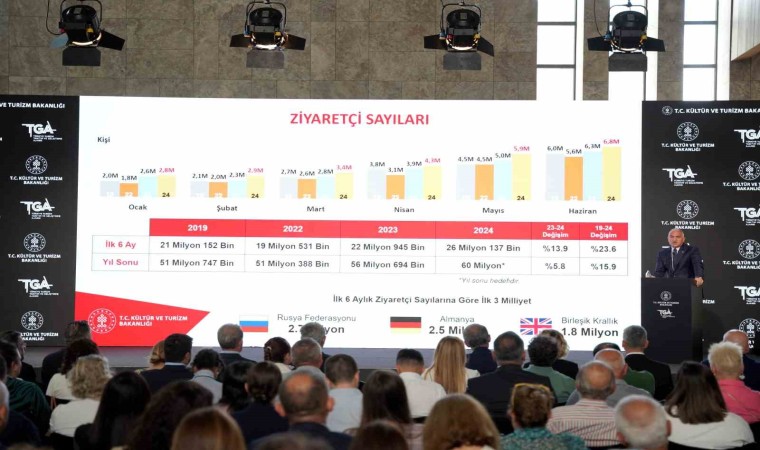 Ziyaretçileri sayılarının ay bazında pandemiden sonra yükselişe geçtiğini ifade eden Bakan Ersoy, “Ziyaretçi sayılarına ay bazında baktığımızda, 2019, 2022, 2023 ve 2024 karşılaştırmaları olarak bakıyoruz. Pandemi döneminde 21 milyon 152 bin olan rekor sayısı pandemi sırasında aşağı inmişti tekrar yükselişe geçti. Bu sene ilk 6 ayda 26 milyon 137 bin rakamıyla rekor bir seviyeye ulaştık. Yıl sonu hedefleriyle uyumlu şekilde büyümeye devam ediyoruz” diye konuştu.