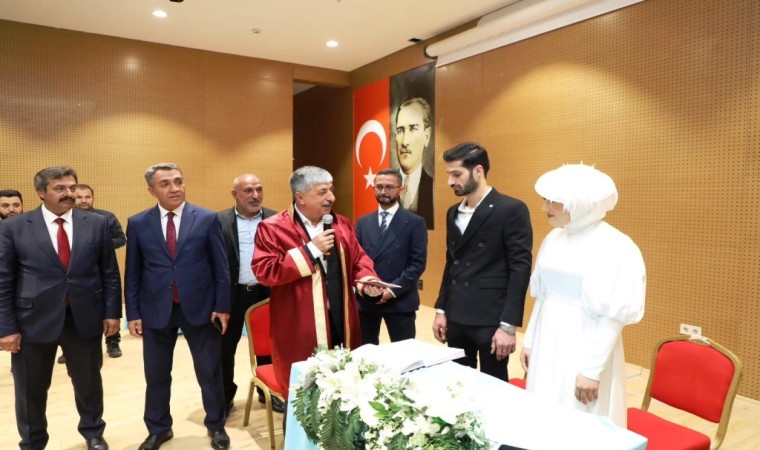 Başkan, evlilik cüzdanını ’Evi dişi kuş yapar’ diyerek gelin Betül’e takdim etti.
