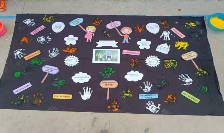 Manisa’nın Sarıgöl ilçesindeki Şehit Esin Akay İlkokulu öğretmenleri ve öğrencileri tarafından Dünya Çocuk Hakları Günü nedeniyle hazırlanan pano okul koridoruna asılarak çocuk haklarına dikkat çekildi.