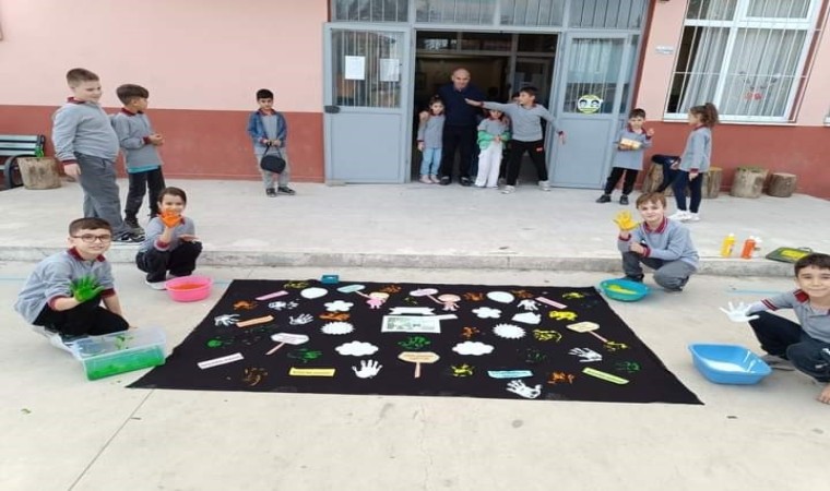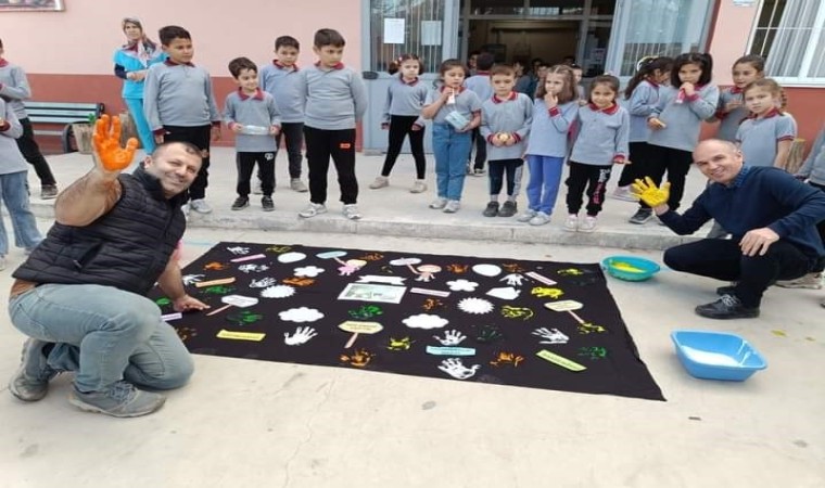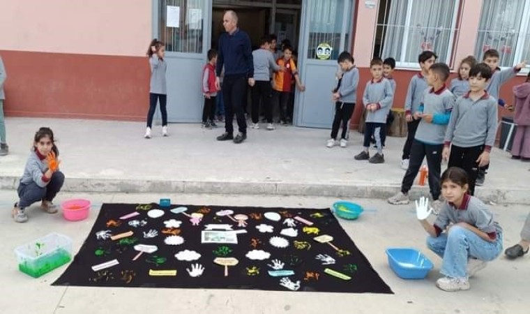 Okul bahçesinde öğretmen ve öğrencilerle birlikte hazırlanan Dünya Çocuk Hakları Günü panosundaki şekiller yapıldıktan sora okulun koridoruna asıldı.